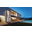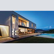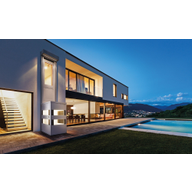 Modernes Haus mit großen Fenstern, Pool und stilvoller Terrasse bei Dämmerung in Münster